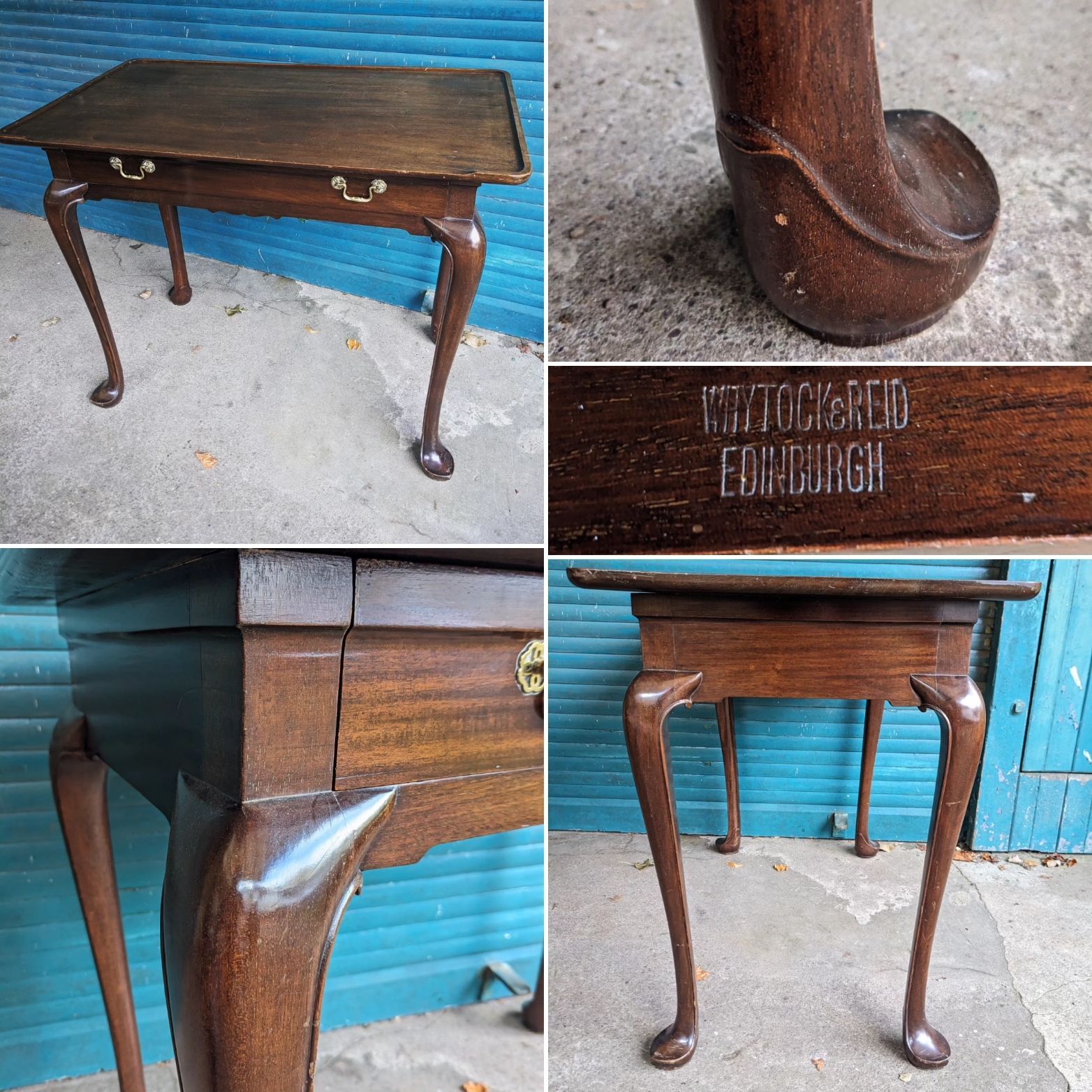 Heavy rectangular top over a concealed drawer and exaggerated cabriole legs with scrolled terminals.