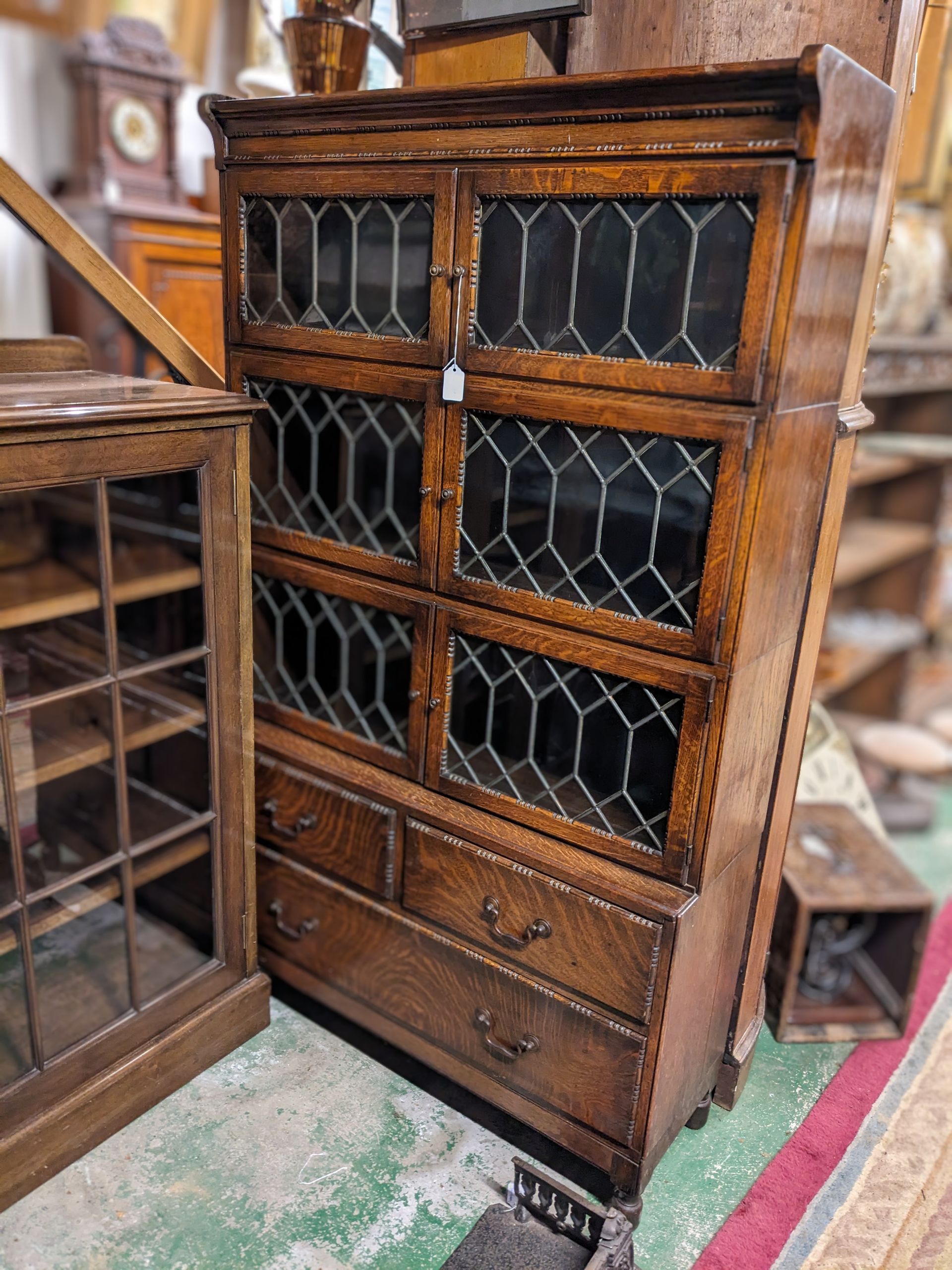 Stained beech and mahogany bookcase on chest.