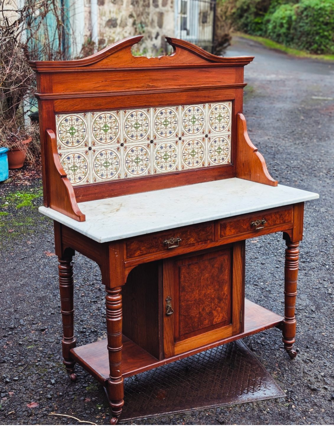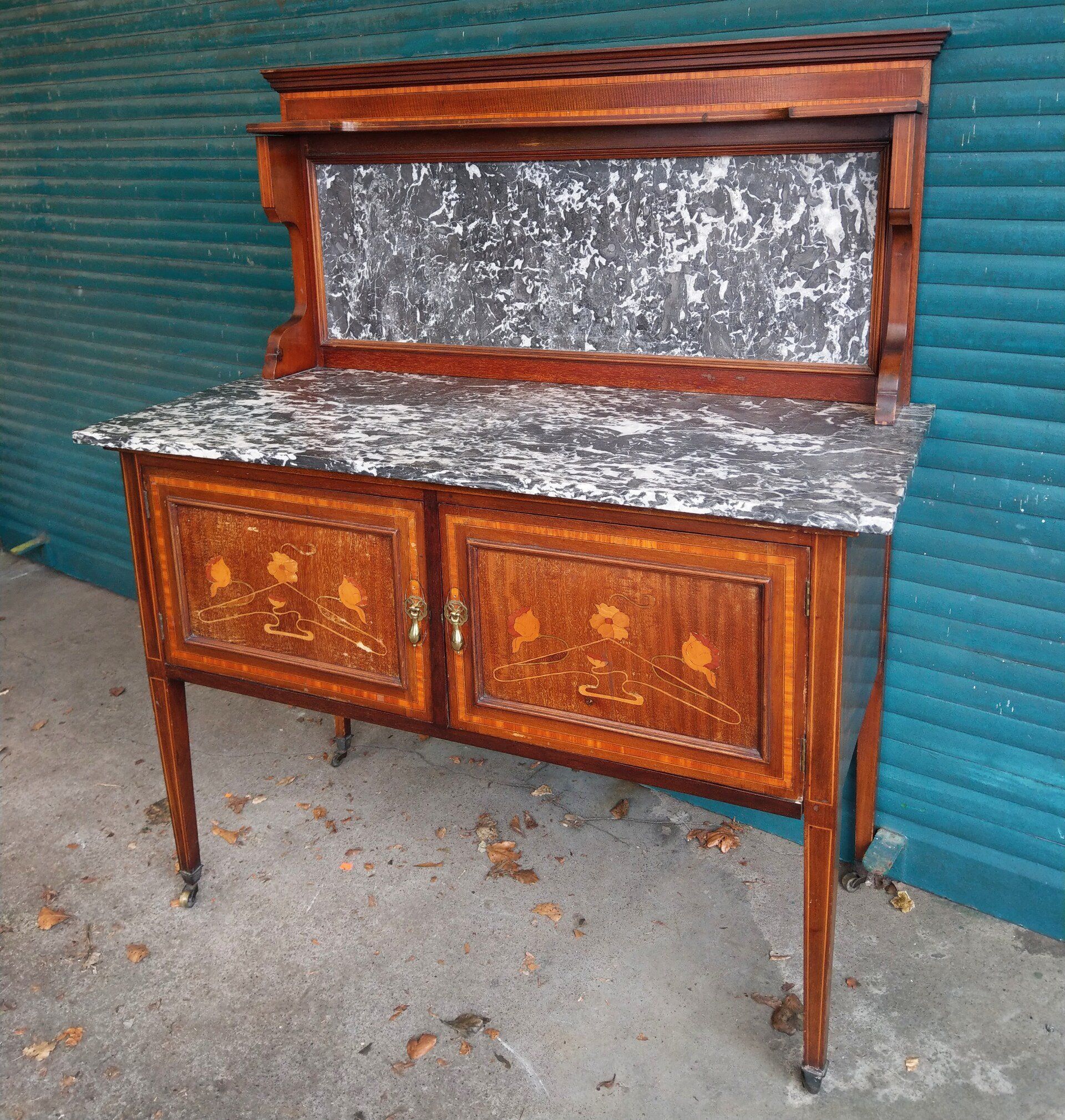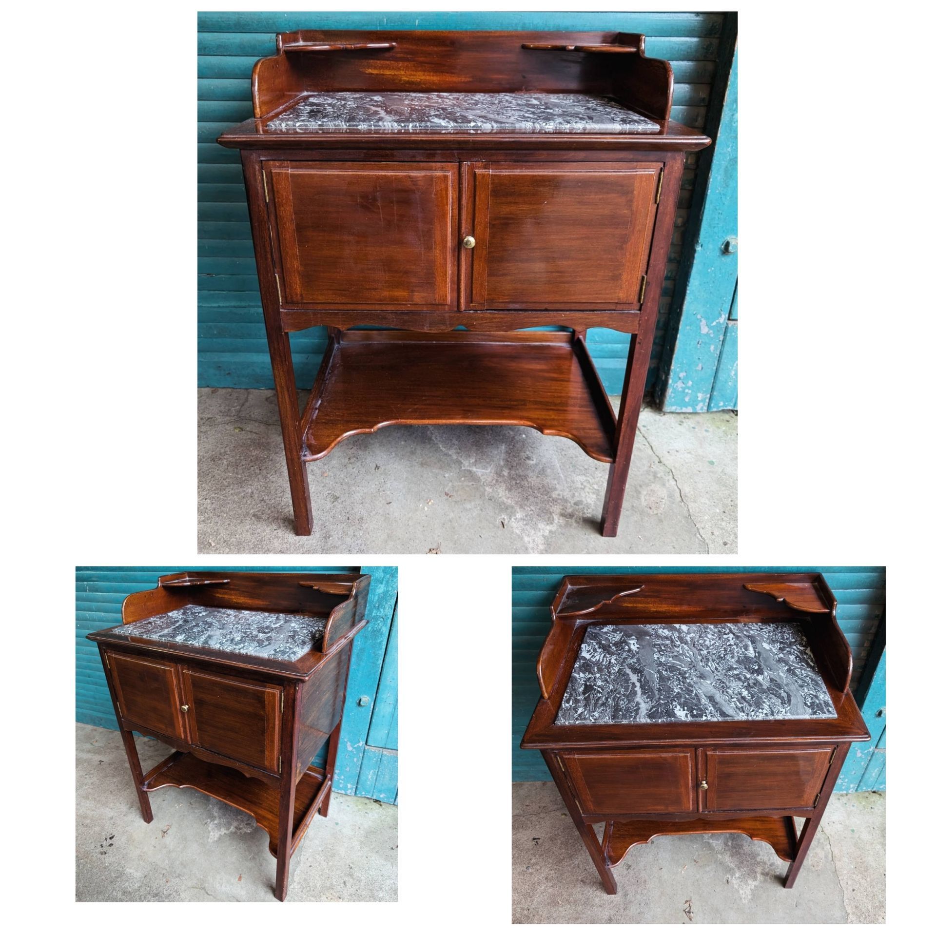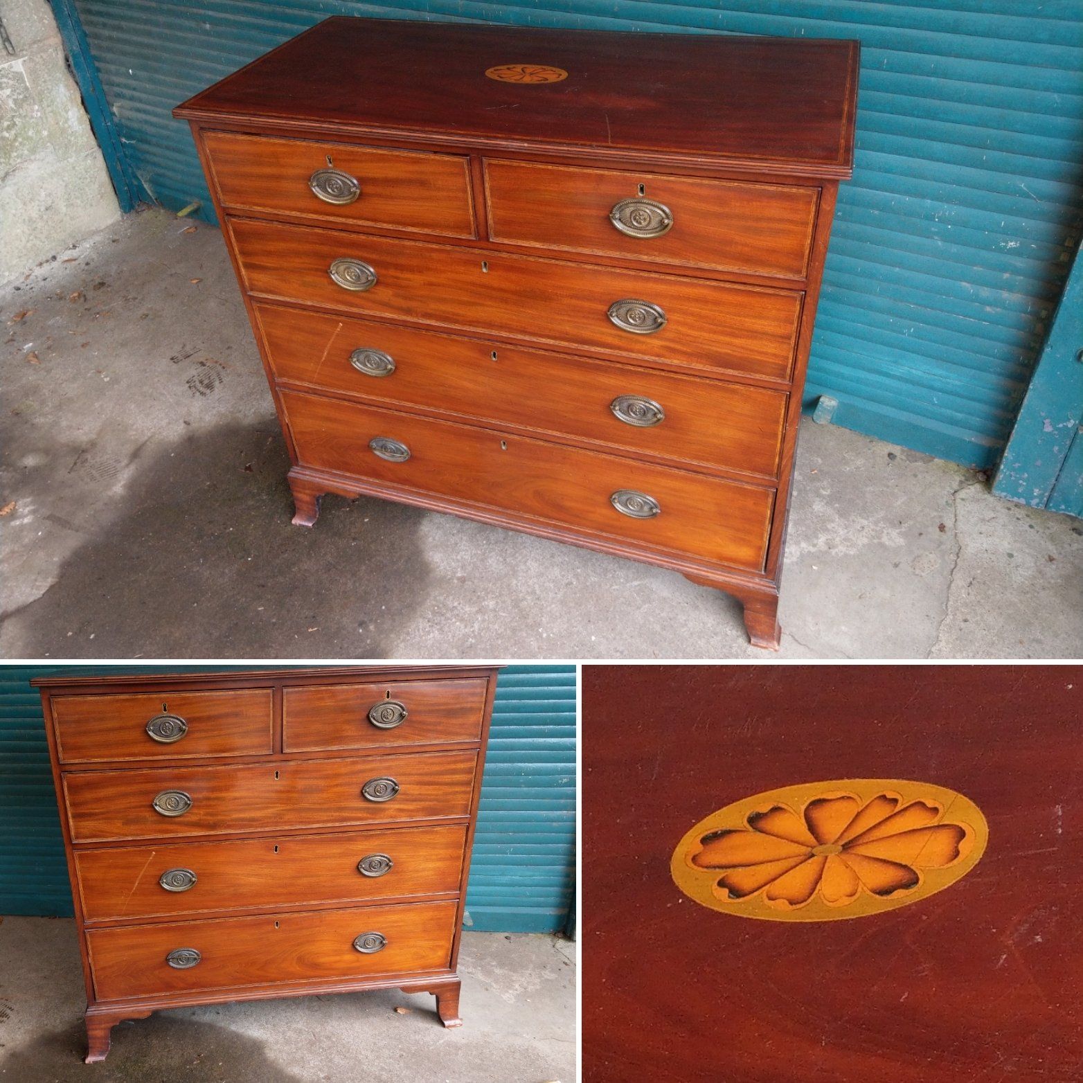 Brass handles, decorative boxwood inlay and satinwood cross banding.