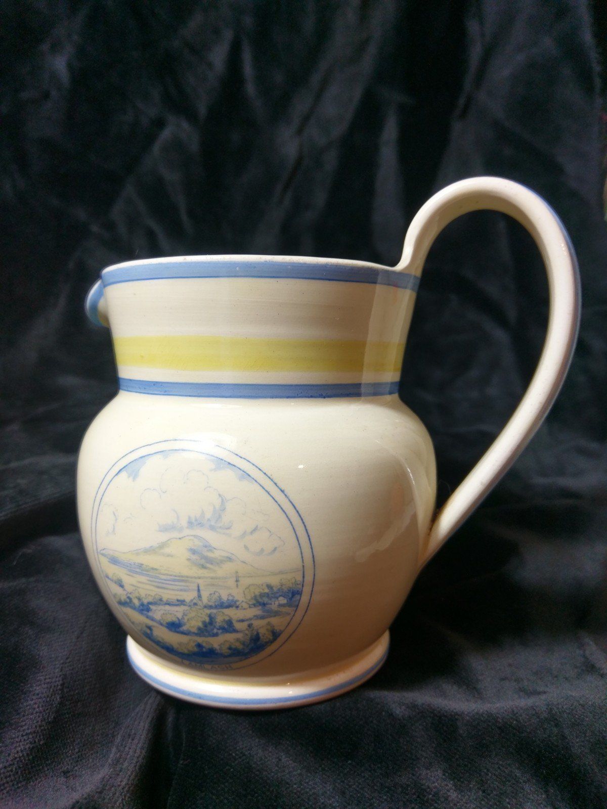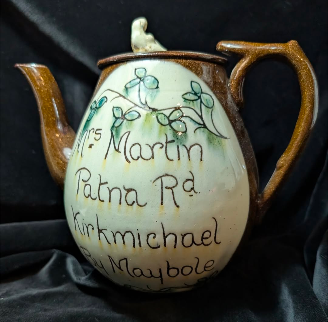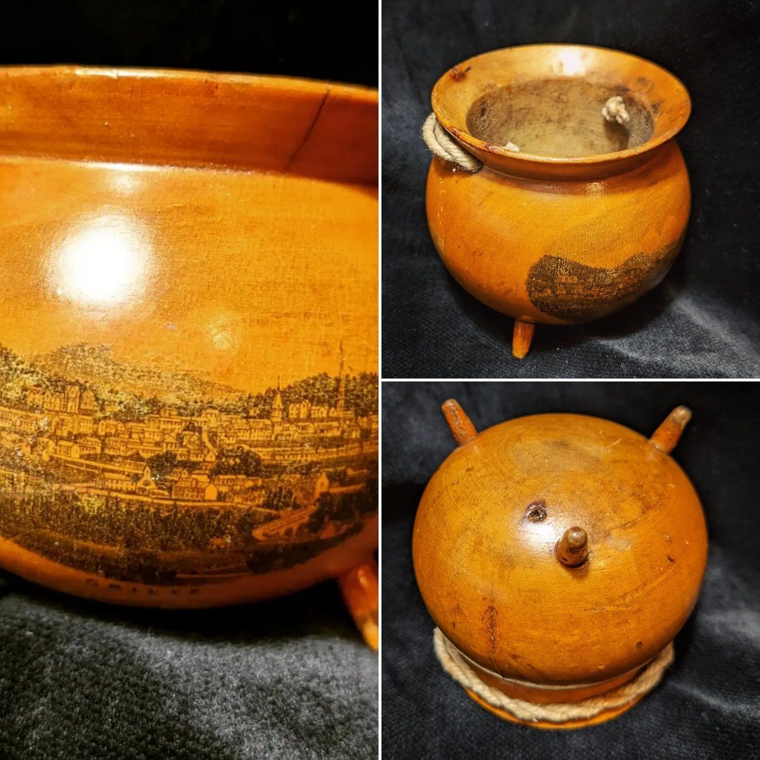 Mauchline ware 3 leg pot or cauldron. View of Crieff. Made in Ayrshire.