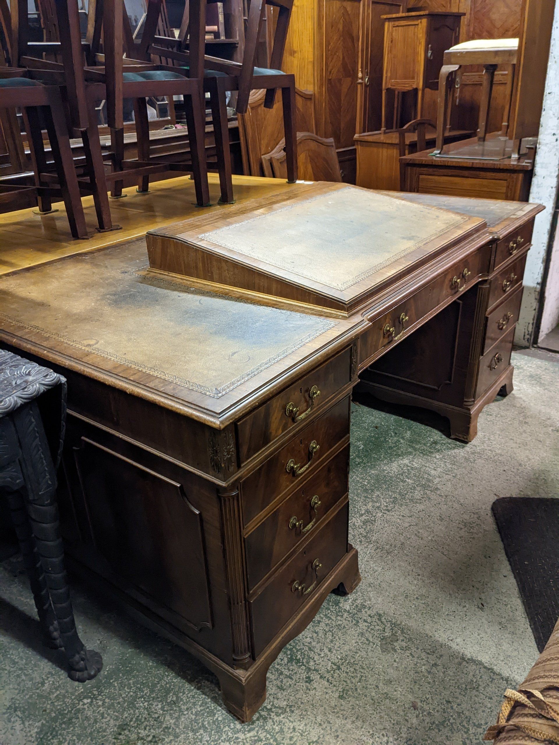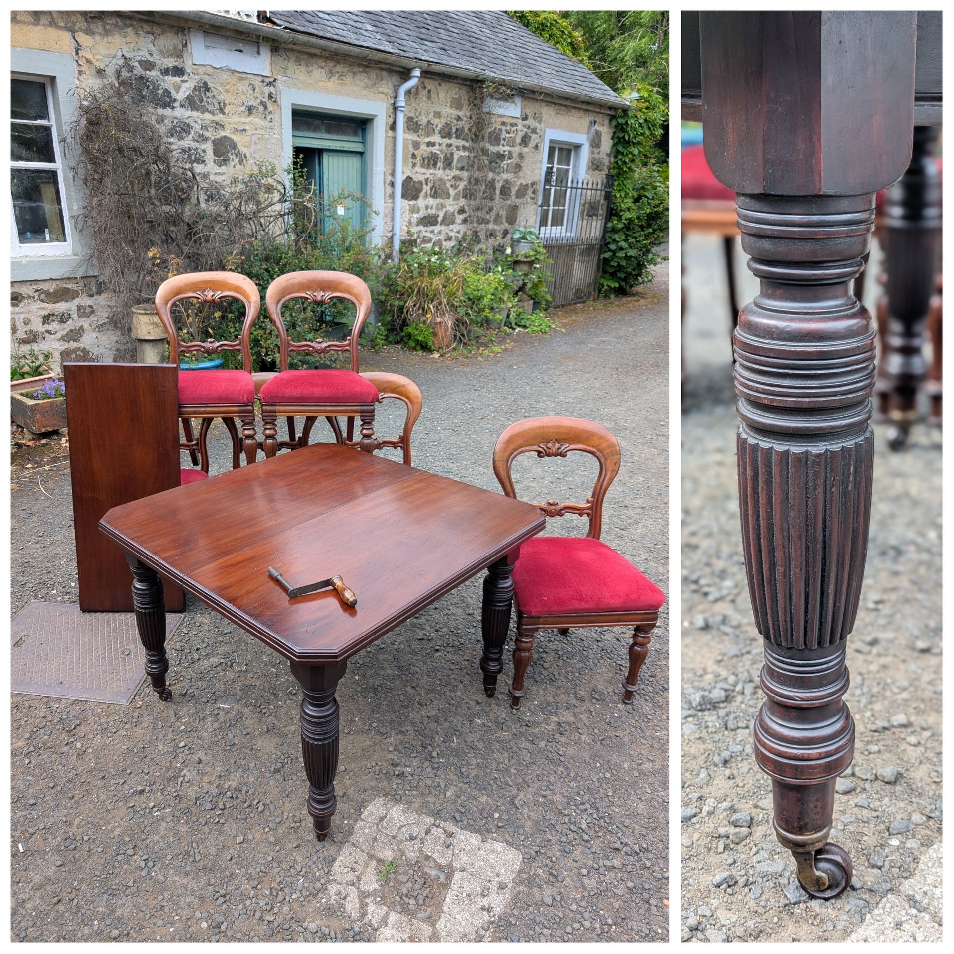 Understated baluster legs with gadrooning and period casters.