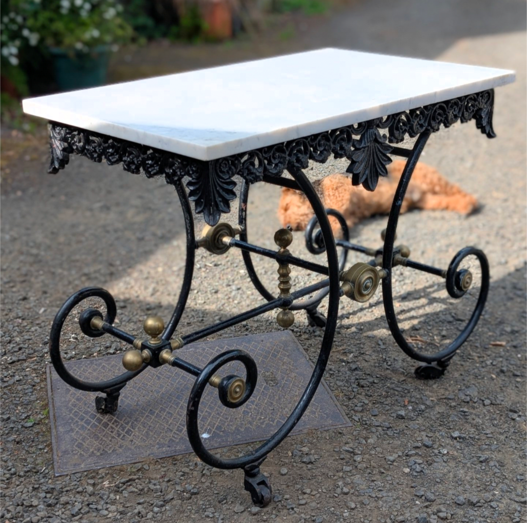 Heavy white marble top with elaborate wrought iron and brass frame.