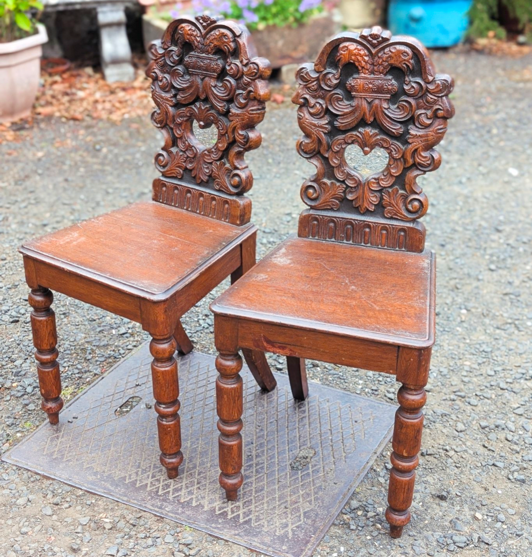 Good pair of 19thC oak hall chairs.