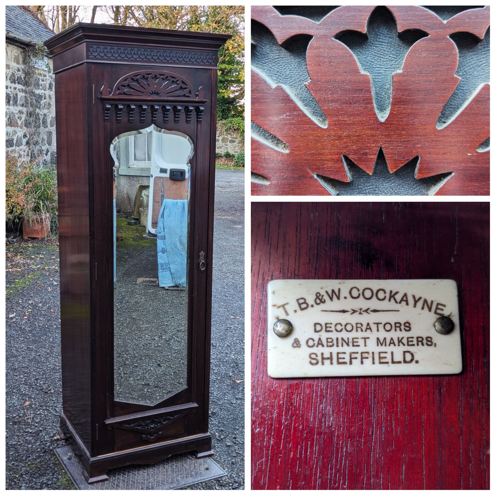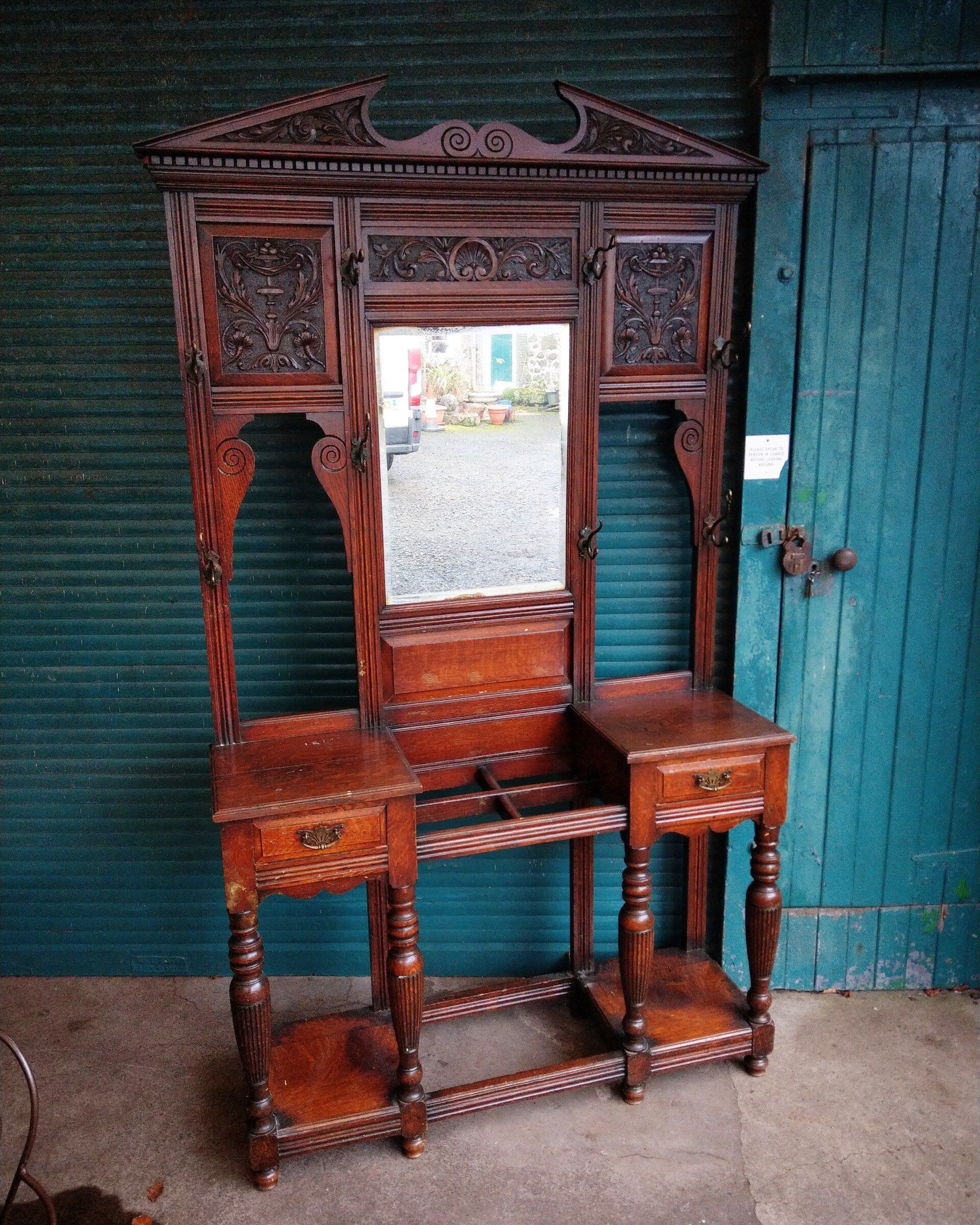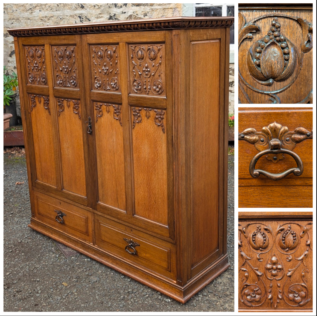 Carved golden oak hall wardrobe.
