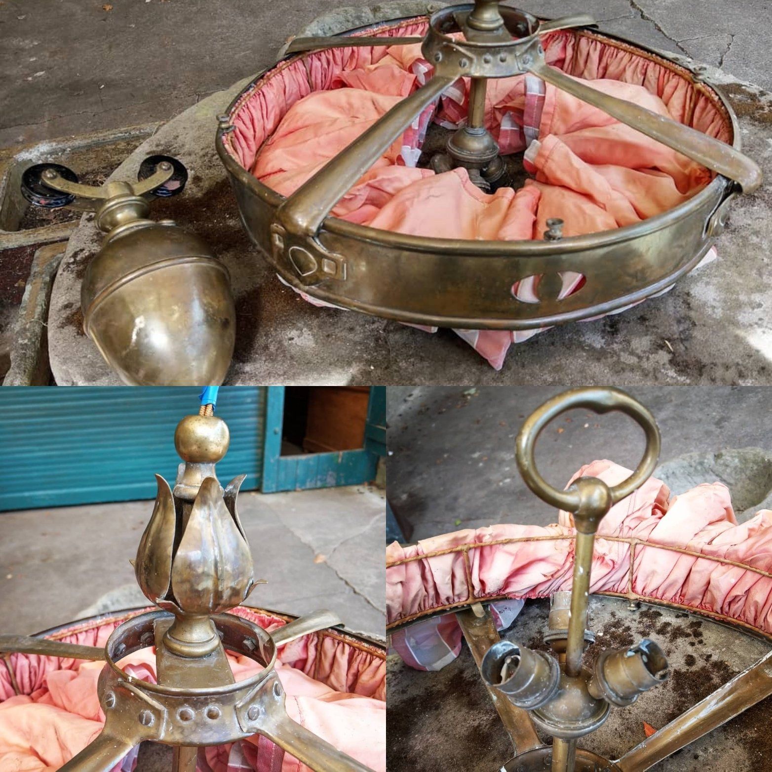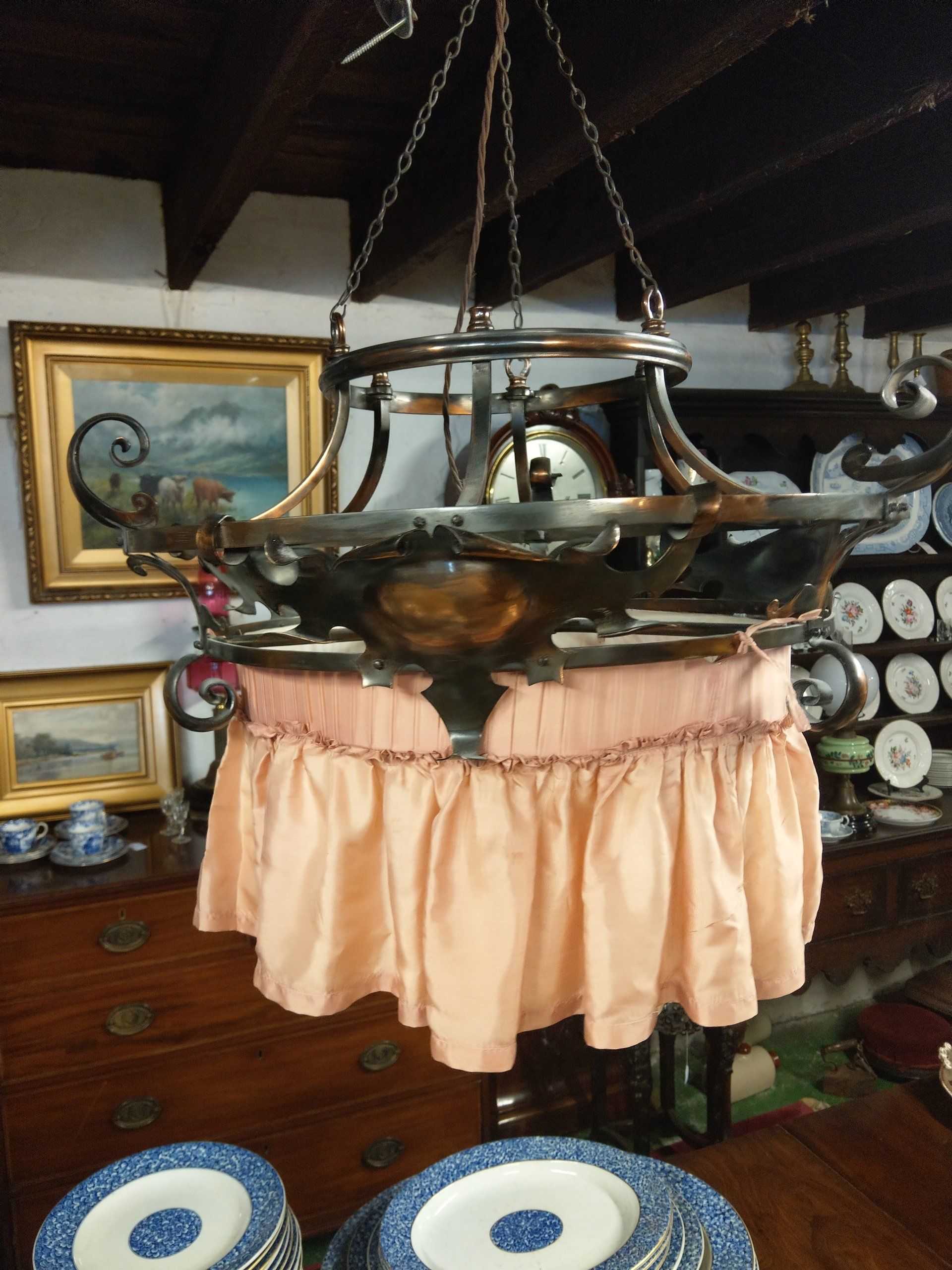 Brass early 20thC arts and crafts ceiling light. It has a weighted fitting for rise and fall if required and an easily removed material skirting.