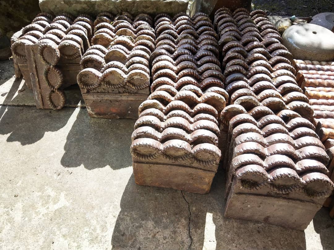 Lot of 19thC Victorian garden edging tiles. Glazed fireclay 11"L X 10"H with an unusual repeating infinity design. 44 in good condition with another 20 odds with some damage.