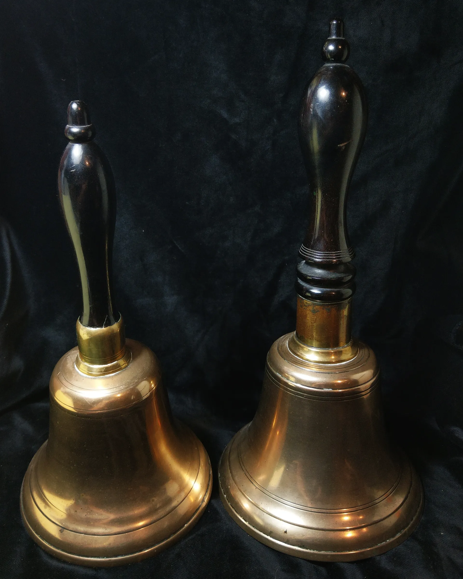 A couple of nice brass 'school' bells with ebony handles. 20thC. 11" and 13" high respectively.