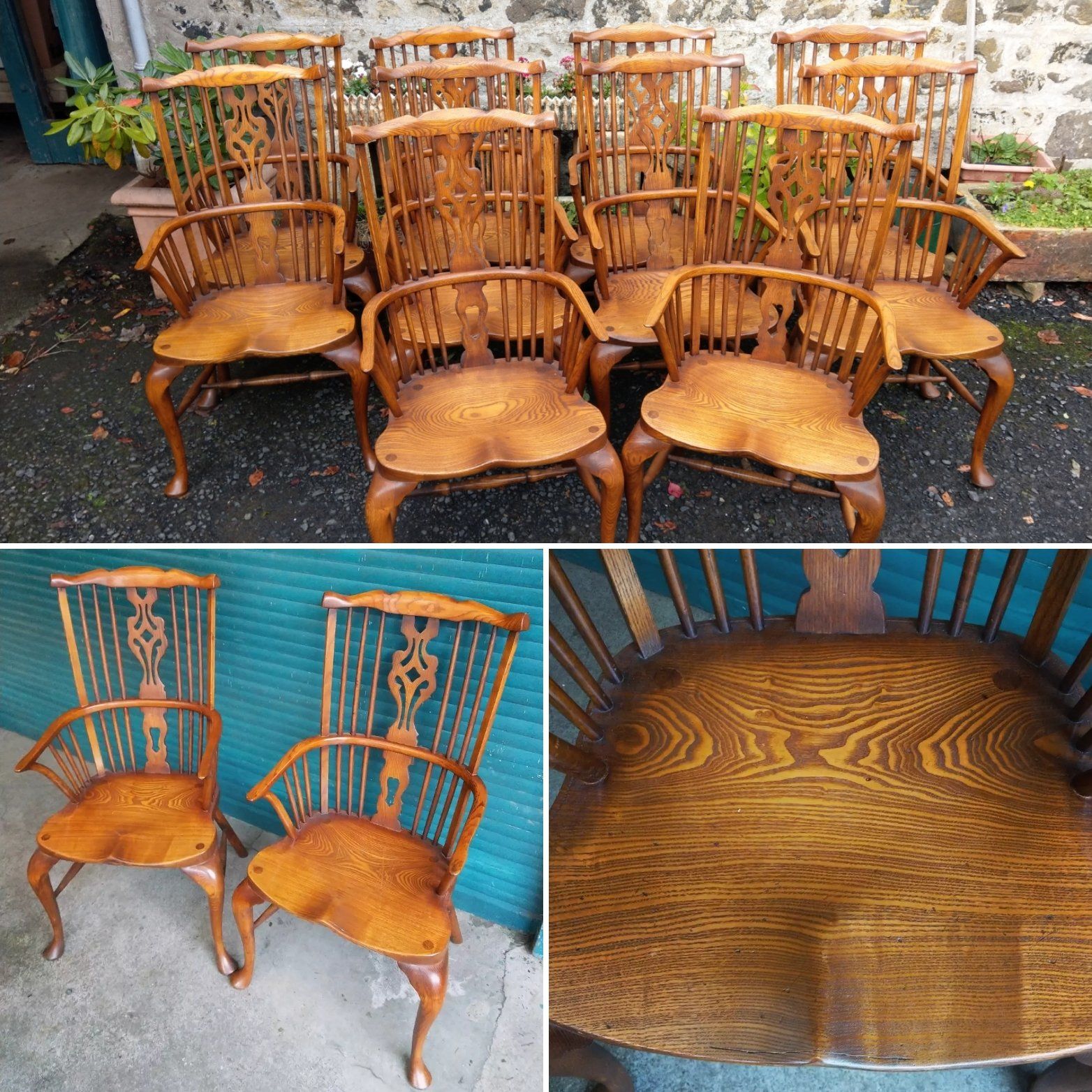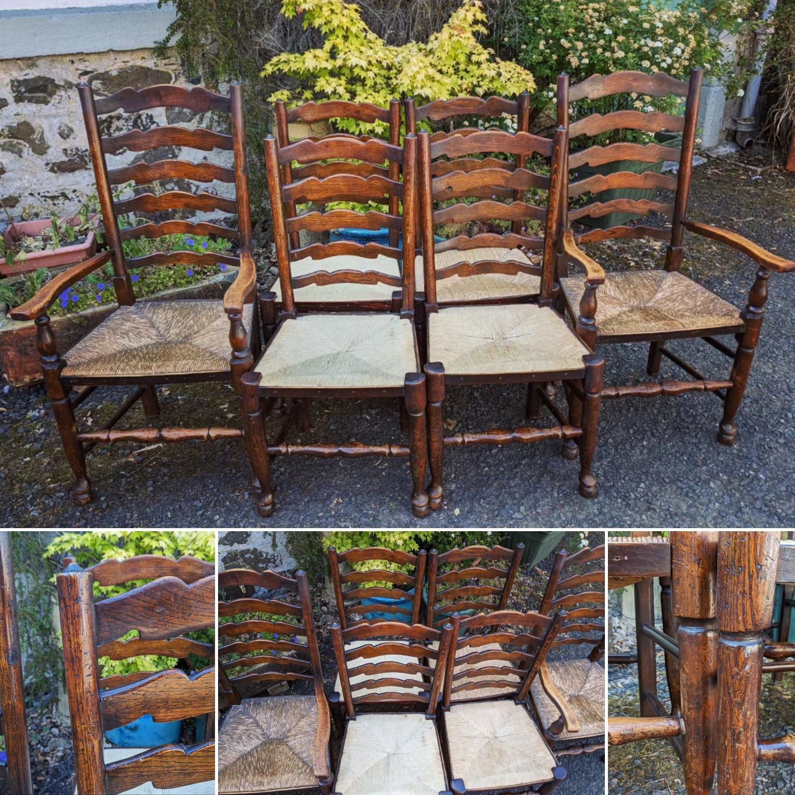 Set of ten oak ladderback country dining chairs.