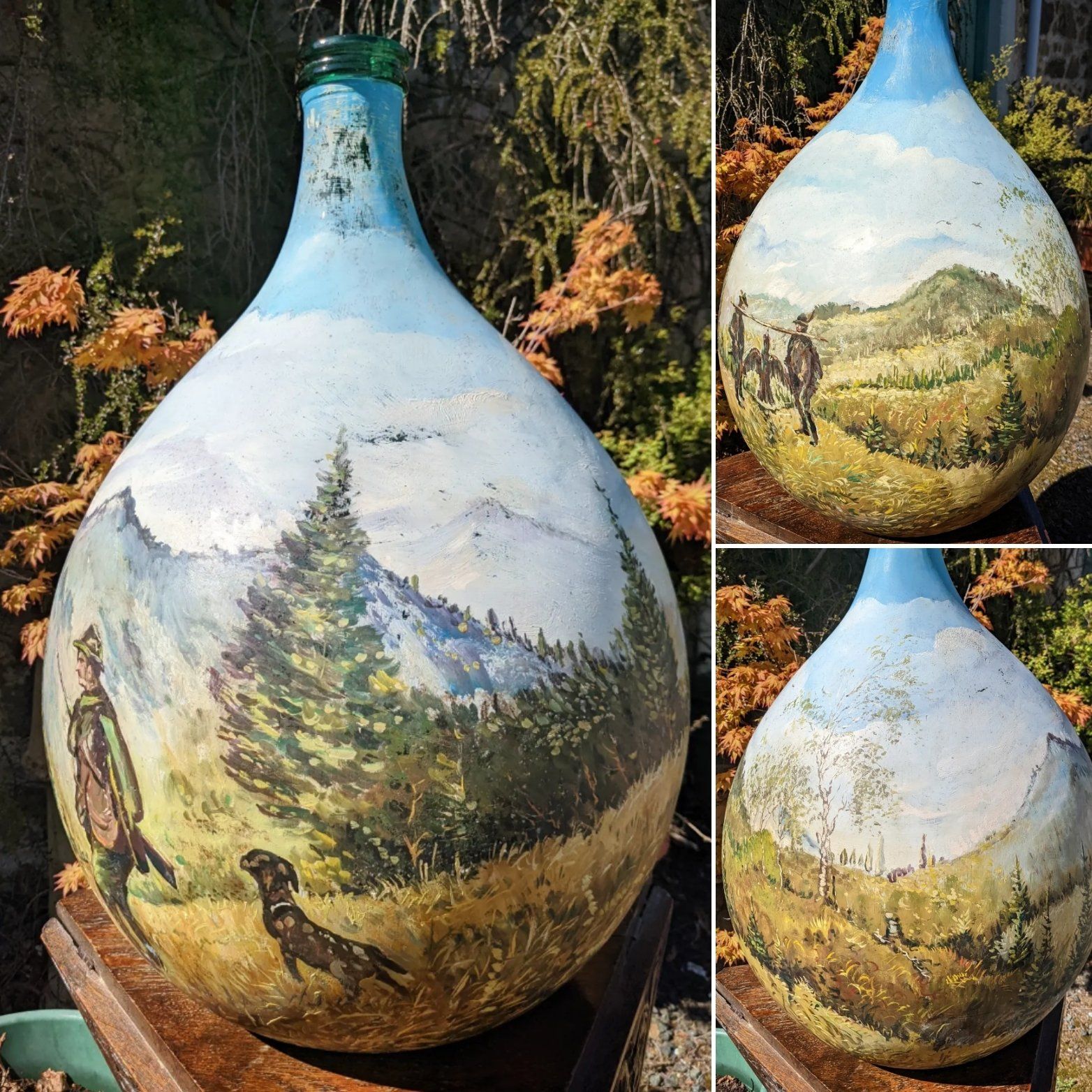 Large green glass carboy with oil painted hunting scene.
