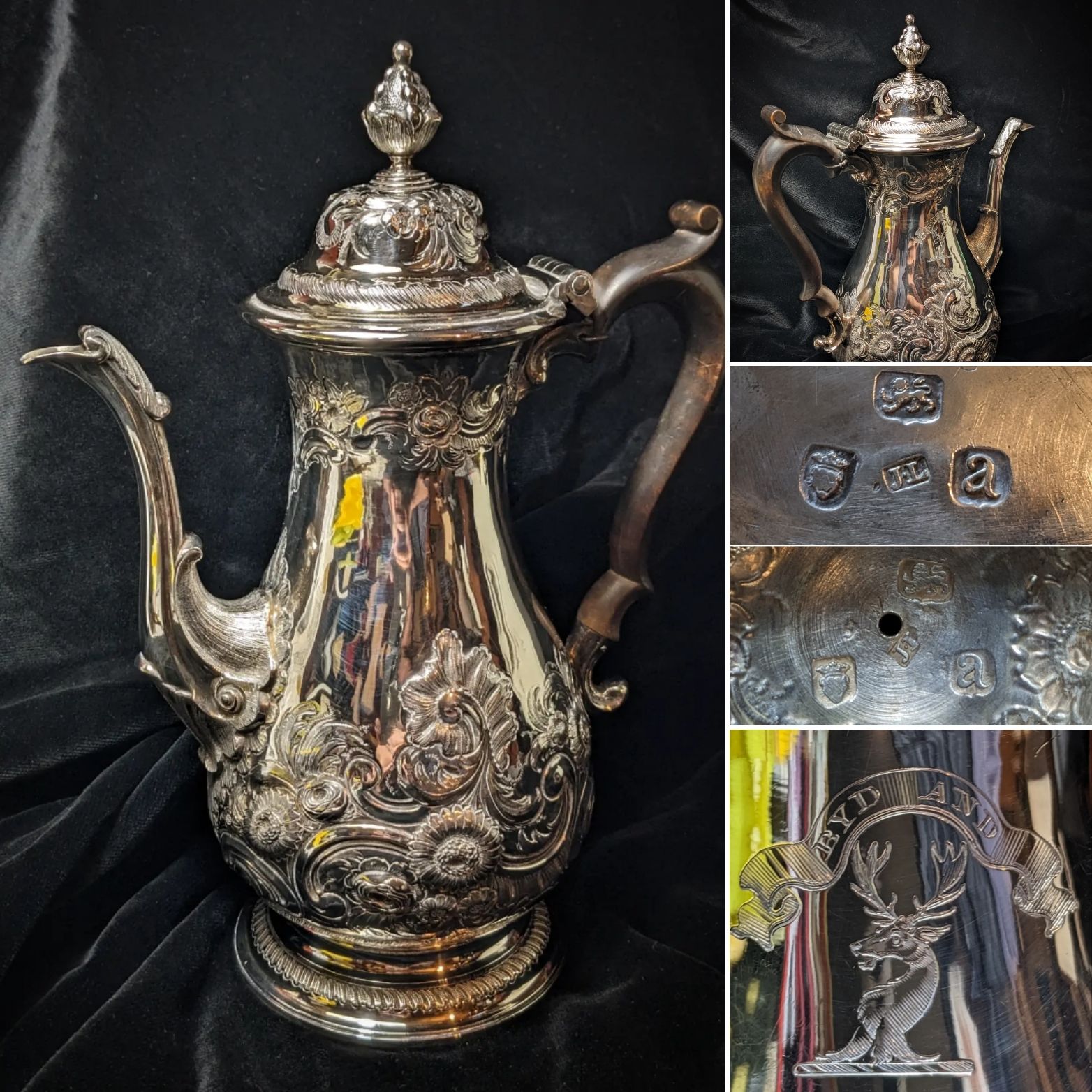 Floriate decoration to the top and mask carvings to the shoulders and terminals of the legs.