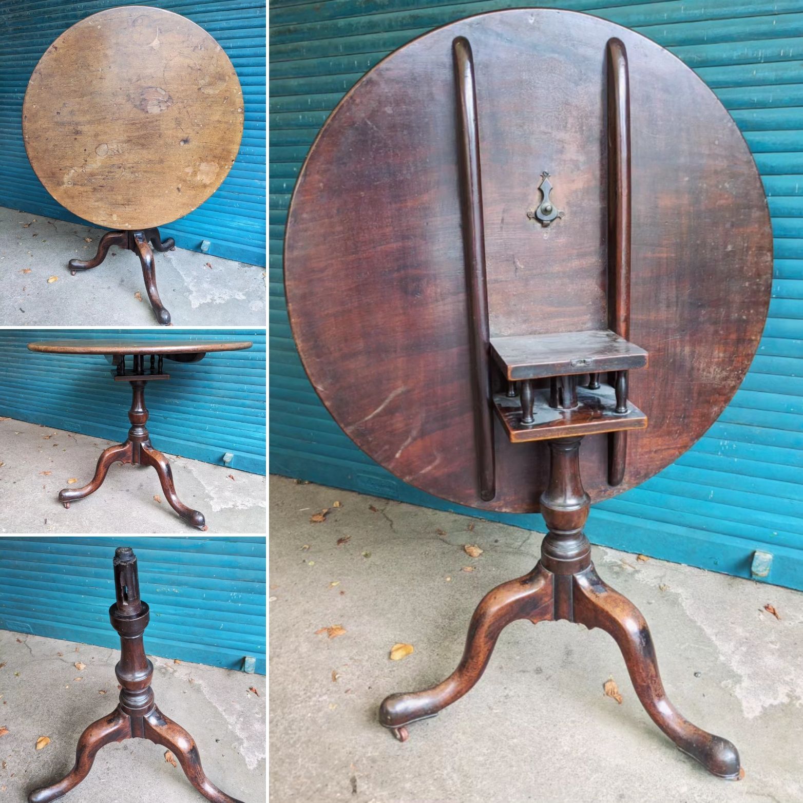 Wheel is 45 1/2" dia with turned spokes and tripod legs.